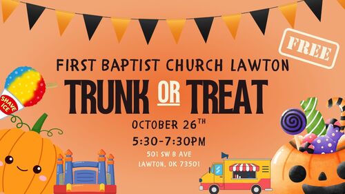 Please join us in praying and preparing for Trunk of Treat! Drop off candy in the bin in the Welcome Center! The event is October 26th from 5:30-7:30 p.m. Sign up to volunteer by providing a trunk or you can sign up to serve on the security team, traffic/parking team, clean up (food tables and trash) team, or a candy runner on fbclawton.org/events. A donation bin will be in the Welcome Center for candy drop off. If you would rather donate money for candy please visit our fbclawton.org/events under Trunk or Treat Candy Donations and select what you like to donate.